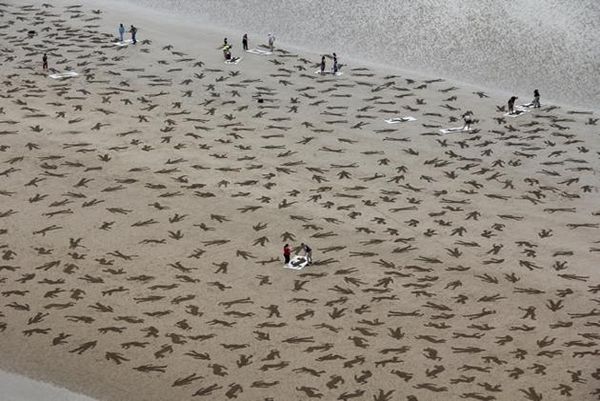 At Arromanches last month, to mark International Peace Day, artists Andy Moss and Jamie Wardley of Sand in your eye, turned into a very moving reality their extraordinary concept of the ‘Fallen Project.’ “The objective was to make a visual representation of 9000 people drawn in the sand which equates the number of Civilians, Germans Forces and Allies that died during the D-day landings, 6th June during WWII as an example of what happens in the absence of peace. . . . On the day we had 60-70 confirmed volunteers that had travelled from around the world to help.  We knew that this was not enough to complete the project in the 4.5 hours that we had so at 3pm when we were about to begin we were overwhelmed by the hundreds of people that turned up to help. . . . [and] took stencils and rakes in hand and embarked on drawing the 9000”
