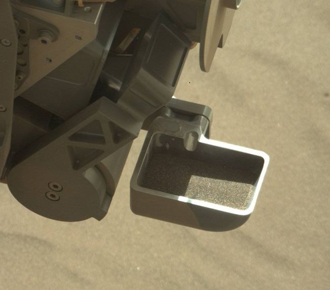 The larger-grain portion dumped onto the ground became accessible to investigation by other instruments on Curiosity, including imaging by MAHLI and composition analysis by the Chemistry and Camera (ChemCam) and Alpha Particle X-ray Spectrometer instruments. Laser-zapping of the dump pile by ChemCam caused an elongated dimple visible near the center of this view.