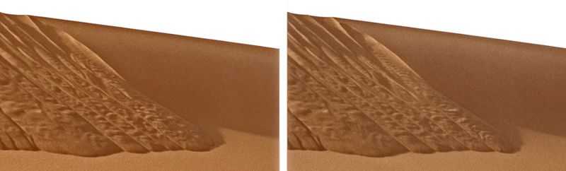 Suddenly, the entire crests of the dunes began avalanching down the steep slip faces, and, in somewhat challenging conditions for photography, I tried to record the way in which successive avalanches poured off the crests, the whole sequence of instability taking on the appearance of a curtain being drawn across the dune face. I’ve reproduced two successive photos below in an attempt to illustrate this. Both images are “anchored” at the same point on the lower left, and, if you trace the number of individual slides from left to right, you’ll see the change from one photo to the next. The curtain of avalanches continued to rush across the face of the dune – but I needed to put my camera away, out of the cloud of blowing dust and sand.