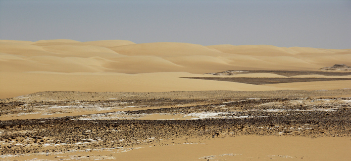 Now, the fact that “large angular boulders litter the floor between dunes” is not the problem - on our own planet, one of the extraordinary things about dunes is the way in which they seem to self-accumulate and hoover up all the sand from the clear, rubble-strewn “streets” between them. It was Ralph Bagnold who set us firmly on the path to understanding why and how this happens - bouncing versus splashing. I saw this phenomenon very clearly in Bagnold’s old stomping grounds of Egypt’s Western Desert, as shown in the photo below - vast areas of pebbles and larger rock fragments, essentially swept clear of sand and encroached on by the flanking dunes.