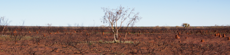 The tunnelling continues far below the surface (termite mound materials that bring minerals from the subsurface have been used for gold prospecting in Australia) and for many metres beyond the mound. The scale of this landscape management activity is staggering: look carefully at this photo of just a small area of the Australian desert, and you will see hundreds of termite mounds.