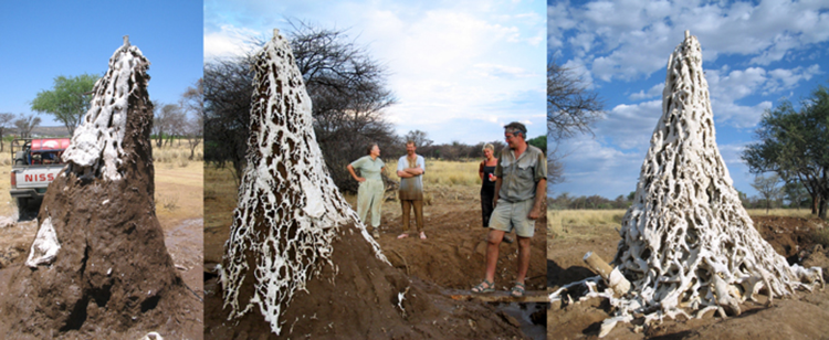 This research is fascinating, but it would not be entirely surprising to farmers in the Sahel who are resurrecting – very successfully – the traditional methods of water management for new trees and for new crops. Digging a planting pit through the hardened surface and adding organic matter creates not only a water-conserving environment for plant growth, but attracts termites that process the organic material for use by the plants and aerate the soil through their tunnelling. And those tunnels are extraordinary. The internal structure of a termite mound (a complex ecosystem in its own right) has been dramatically demonstrated by the work of Scott Turner at The State University of New York College of Environmental Science and Forestry. Through taking plaster casts, he reveals the architectural skills of the ecosystem engineers as strange and compelling sculpture: