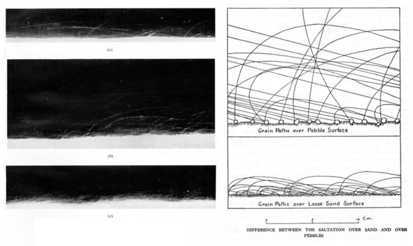 Now, if you feel so inclined, go back to my post on Ralph Bagnold, “The man who figured out how deserts work.” And then check out “Splashing around on Mars.” In the latter, I talk about saltation and Bagnold’s work on the movement of sand – the way in which the wind causes grains to skip and leap in graceful but frenetic and attenuated parabolic trajectories, crashing into their colleagues and sending them, in turn, on their way. This is the mechanism by which huge amounts of sand move long distances in the wind and induces the other mechanism: surface creep or reptation. Saltating grains plummet to the surface and knock others along. Watch the video again and note the wonderful way in which both of these processes are captured, the sunlight picking up the ballistics of the saltating grains and the the busy rushing crowd of their reptating friends. Bagnold illustrated his wind tunnel work and the process of saltation with the following figure (from his enduring classic, The Physics of Blown Sand and Desert Dunes, reproduced by permission of Stephen Bagnold).