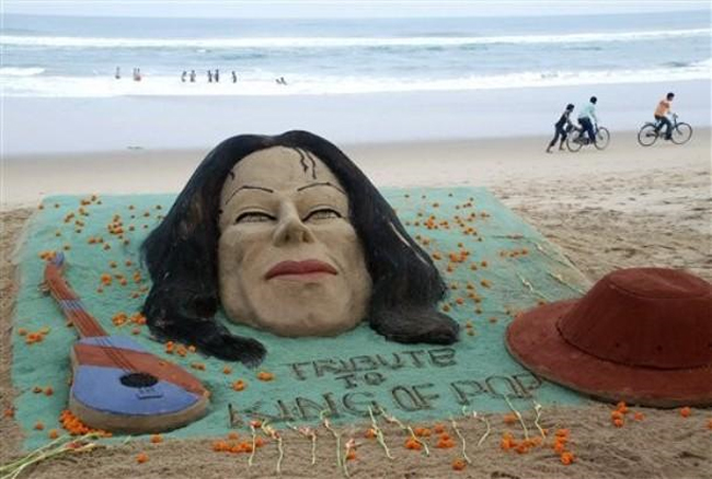 My daughter has long been a devoted fan of The Simpsons, and sometimes puts her encyclopedic knowledge to the test by challenging us to find any random topic for which she can’t cite an episode that includes or addresses it; so far she has succeeded in all challenges. In recent times it has occurred to me that the same game can be played with sand and I thought that the subject of the recent and ongoing world headlines would be an interesting test. Now I will readily admit that a comprehensive inventory of the works of Michael Jackson is not something that I devote a lot of my increasingly precious brain cells to, and so this required a little research (cheating, by my daughter’s standards). The image below was easy, since it’s all over the net, a tribute sand sculpture by the Indian sand artist, Sudarsan Patnaik, on Orissa’s Puri beach and created in four hours with the help of students of his Golden Sand Art Institute and a couple of tons of sand. But this is a tribute, a posthumous creation - what about the classic works, surely some sand references there?