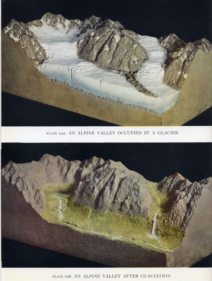 For me, this was magic. I was captivated by the illustrations, several of which I’ve reproduced here. I scrutinised the models in detail and even tried, messily, to make some myself. They opened my eyes to how landscapes and their foundations worked, I could look around me on those summer holidays with a different understanding—I could visualise things. And, best of all, some of the models depicted change: for example, the appearance of a glaciated valley when it was still filled with ice and after it had melted (good for Welsh or Scottish holidays!). My curiosity about the world around me was aroused. I was alerted to geology.
