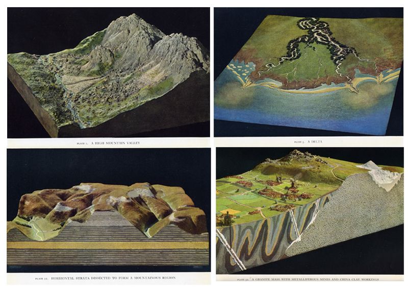 Probably the best-known of Stamp’s books is Britain’s Structure and Scenery, but for me the true treasure, the book which I now appreciate fired my fascination with geology, was The Earth’s Crust—A New Approach to Physical Geography and Geology. Published in 1951, it was called “a new approach” because Stamp commissioned huge, detailed models of different landscapes—and what lies beneath them—to be made in exquisite detail by Tom Bayley, a lecturer in sculpture, and photographed in colour for the book.
