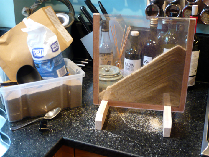 I resolved to try this for myself - the drama of the demonstration being ideal for the occasional talk that I give; not being confident about sawing perspex in my apartment garage, I once again sought the help of Trevor (who had built my arenophile shelves). When he arrived with the device, I was like a kid with a new toy - but nervous as to whether it would work. I had prepared a mixture of “play sand” and granulated sugar, and set up (my wife again long-suffering) in the kitchen. With a slightly shaking hand and an envelope with the corner cut off as a makeshift funnel, I poured the mixture into the cell (and on to the kitchen counter, floor, etc.). To my amazement (and that of my audience), it worked!