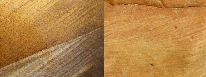 All I had to do was control the rate at which I poured, and the avalanching grains did exactly what they were supposed to do - they self-segregated and spontaneously stratified. In the interests of cleaning up the kitchen, I moved the cell, causing further avalanching and truncation of the underlying original pattern. I then tried it with just the play sand and, lo and behold, the dark grains separated themselves from the light grains. To the geologically-inclined, this pattern will be all too familiar - I had made cross-bedding. The second image below shows my experiment on the left and natural cross-bedding on the right.