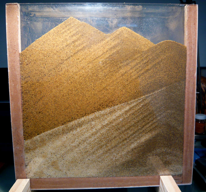 Cross-bedding is formed when any mixture of sand grains is swept along by a current - whether water or air - and deposited, building up a slope, down which the next surge of grains cascades. Cross-bedding (so-called because it forms at an angle to the main surface of deposition, e.g. the beach) is found in ripples, river sand banks, marine bars, and dunes - essentially anywhere that sand falls out of a current. It tells us a great deal about the nature of the fluid flow, its direction, strength and so on - and the only reason we can see it is because of self-segregation and spontaneous stratification, grains of different colours (and different physical characteristics) picking out the internal structure. And, thanks to Hernán Makse, Philip Ball, my long-suffering wife, and Trevor, I had demonstrated this in my own kitchen.
