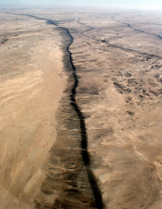 As in Bhuj, liquefaction during an earthquake also shows up in bizarre ways. Layers of sand below the ground surface will liquefy and, under the pressure of the overlying sediments, will exploit any fissure or other line of weakness to flow upwards and burst out on the ground surface as an eruption of sand and water. Known variously but descriptively as sand volcanoes, boils or blows, these can appear anywhere. The image at the head of this post shows a sand volcano that erupted during the Loma Prieta earthquake in the median of Interstate 80 west of the San Francisco-Oakland Bay Bridge toll plaza. The images below are of sand-inundated fields after the Loma Prieta event (left) and, right and below, the Imperial Valley earthquake of October 15 1979 (this seems to be a good week for California earthquake anniversaries).
