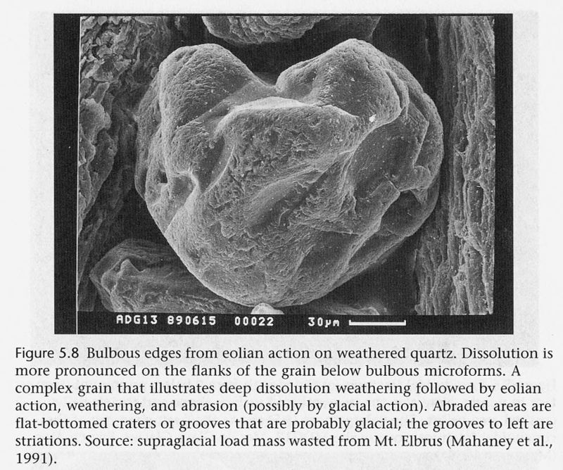 All this is by now, of course, a long way from my simple Pocket-Size Sand Grain Sizing Folder, but the principles are the same. It’s extraordinary the stories that sand grains have to tell. I will leave you with an image from what has now become a classic, W.H. Mahaney’s 2002 Atlas of Sand Grain Surface Textures and Applications: