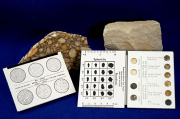 Concerned about the origin of the sand covering your car after the kids have borrowed it? Or where that cowboy builder is getting his supplies from? Curious about why the sands on one beach make much better sandcastles than those of the next one along the coast? Or why the sand traps/bunkers on one golf course are more deadly than another? Or, then again, maybe you’re a geologist. For you, the handy-dandy Pocket-Size Sand Grain Sizing Folder could be the solution. Is available from the Geological Society of America or directly from SGE* at Kent State University for a bargain price, and I have recently become the proud owner of one. It’s a very visual reference for several ways of describing sand, first of all, of course, size. Size is the only character that defines a granular material as sand, and the size categories (from “very fine” to “ very coarse,” much like sandpaper grades) progress in multiples of two – 1/16 to 1/8 mm, 1/8 to 1/4 mm and so on up to 1.0 to 2.00 mm – simply because nature works in multiples rather than linearly (think of a square versus a line, a cube versus a square). Anything finer than very fine sand is silt or mud, and things coarser than very coarse sand are granules, pebbles, cobbles, and boulders. This scheme has a real physical basis: sand-sized materials behave very differently from anything bigger or smaller – and that behaviour is often quite bizarre (as I’ve described on several occasions – see, for example, the formation of convection structures). The Pocket-Size Sand Grain Sizing Folder provides a direct reference to sand size categories by including small samples of real sand (see the illustration at the top of this post).