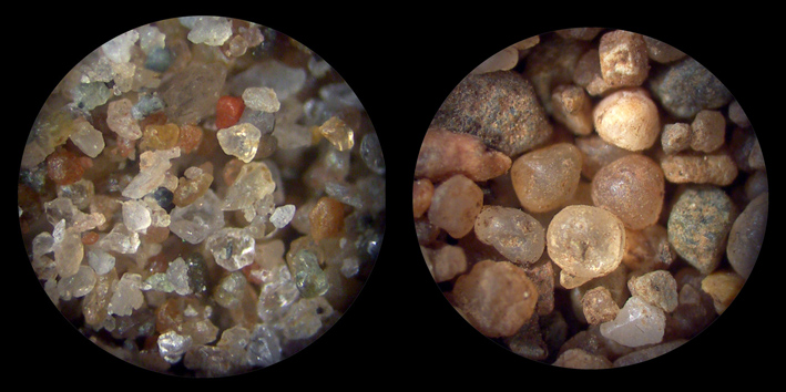 But the folder does more than give a reference for size – it provides graphics of poorly-sorted and well-sorted sands in three different size categories, a key character of how uniform or otherwise is the range of size of the grains in a particular sample. Sorting provides clues as to the transportation biography of a sand – wind-blown sand will contain a much smaller range of grain sizes (i.e., better-sorted) than a river or shoreline sand simply because the capacity of the wind to transport larger grains is much lower than that of water. But it’s not that simple: sand transport is a complex process that continues to occupy researchers in fluid dynamics as well as sedimentology. The two sands below are from, on the left, a beach and, on the right, dunes just a few meters away. Not only are they different in size (in this case, oddly, the dune sand is coarser than that of the beach), but the beach sand is more poorly-sorted than that in the dunes.