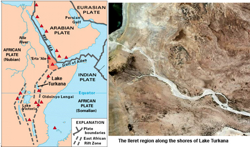 [http://www.sciencemag.org/cgi/content/abstract/323/5918/1197; http://archaeology.about.com/b/2009/02/26/ancient-human-footprint-discovery-in-kenya.htm; http://www.sciam.com/article.cfm?id=15-million-footprints-uncover. Footprint photo Professor Matthew Bennett, Bournemouth University; Rift Valleys map, USGS]