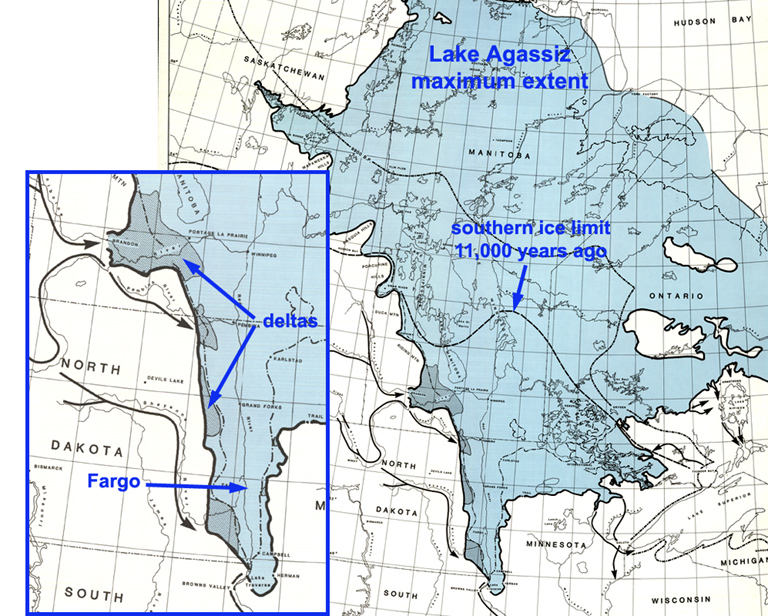 [sandbagging photos from http://minnesota.publicradio.org/display/web/2009/03/20/fargo_dikes/; Lake Agassiz map from the Geological Association of Canada, available from the University of Manitoba Libraries Map Collection, http://www.flickr.com/photos/manitobamaps/2091302531/in/set-72157603391175172/. For a good summary of Lake Agassiz, see the North Dakota Geological Survey document at https://www.dmr.nd.gov/ndgs/ndnotes/Agassiz/Lake%20Agassiz.asp]