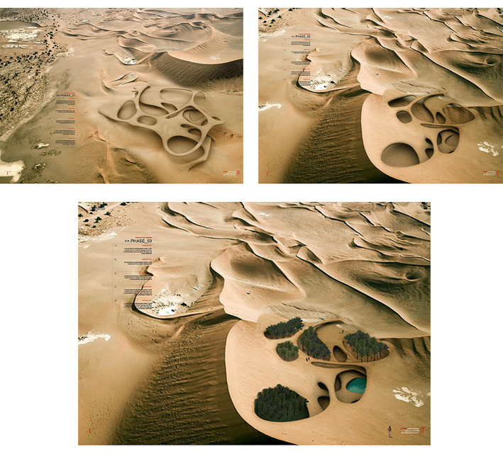 Among the patterns and forms that inspired Larsson (and Gaudi - see previous posts) are tafoni, “a cavernous rock structure that formally ties the project back to notions of aggregation and erosion.” He describes how bacillus pasteurii could be harnessed to sculpt the desert into those forms that speak of one moment in time, but endurably, sustainably, providing not only a barrier against desertification, but habitable and cultivatable envrionments: