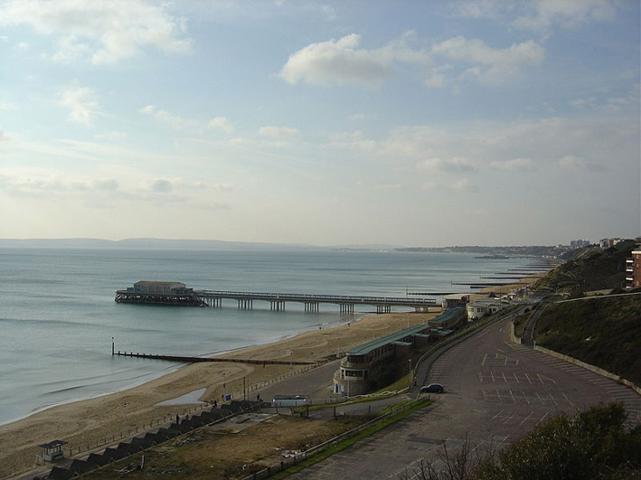 [coastal photograph: http://commons.wikimedia.org/wiki/File:Boscombe_Pier_November_2005.jpg; construction photographs: http://www.bournemouthsurfreef.com/tag/construction/]