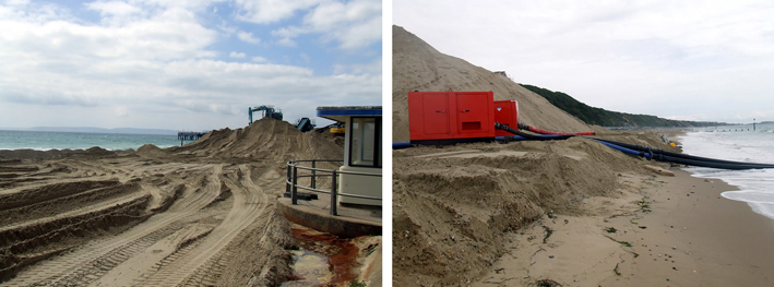 The project was scheduled to be completed last year, but was, of course, dependent on reasonably good weather. However, this being the British Isles, the weather last summer was distinctly uncooperative, the work had to be suspended and the contractors returned to more balmy southern hemisphere climes (although their accommodation is still being paid for). Inevitably, thousands of tons of unused sand remains stockpiled on the beach, an eyesore for residents; but at least the eyesore is diminishing as, during the course of British coastal winter, the sand is being, shall we say, redistributed.