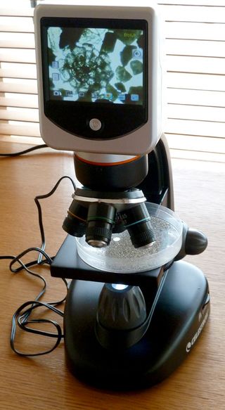 It’s the “LCD Professional Digital Microscope Model # 44345.” It is, like most microscopes within the reach of the amateur, primarily for biological