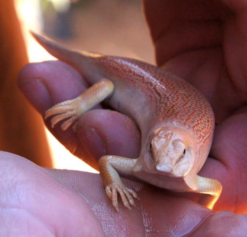 Charming chap, or chapess. So much prettier than a naked mole rat, a star mole, or other near-surface dwellers. Thanks for the encounter, and the splendid photos. Skink \*and\* swim. Hope the camels were as engaging. Glad your journey went well.
