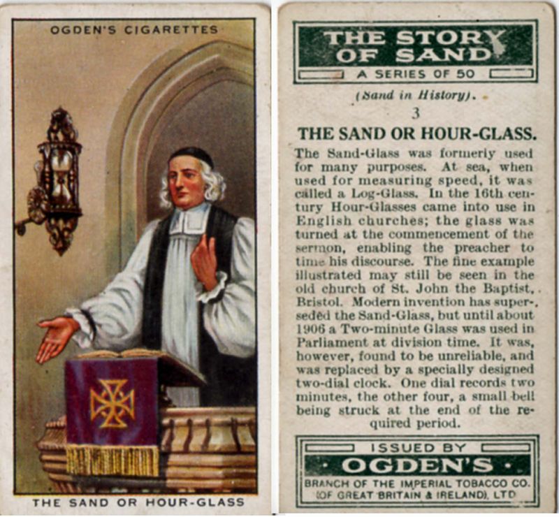 All of these have today become collectors’ items (I’ve seen the habit described as “cartophily” – as in “I confess that I’m a cartophiliac”). But what does this have to do with my particular topic? Well, in 1934, Ogden’s produced a series of cards titled “The Story of Sand,” a set of fifty different topics. A complete set in decent condition goes for around $90 – and, of course, I have one. The theme and the diversity of topics covered essentially anticipated my book by seventy years – or perhaps my book is simply a reprise and an update. Essentially all of the topics covered in the set of cards have found their way into my book somewhere, but this is, as much as anything, simply a reflection of the diversity of roles that sand, the unsung hero, plays. Of course, one of my favourites is the hourglass card – a reminder of the short duration hourglass that Queen Victoria had installed next to the pulpit at Windsor Castle.