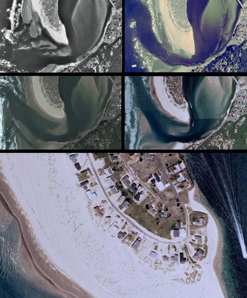 The buried houses are built on a shape-shifting promontory of sand, the Alsea Sandspit, and here is a photo of it from 1975 (compare with the Google Earth images below):