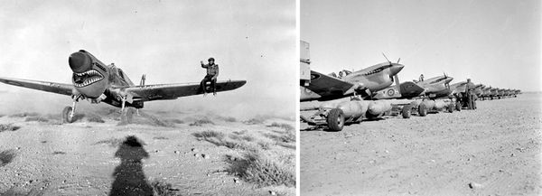 Left, “A Curtiss Kittyhawk Mark I of No. 112 Squadron RAF taxies through the sand at a landing ground in the Western Desert. A mechanic sitting on the wing is guiding the pilot, whose forward view is obscured by the aircraft’s nose.” Right, “Trolleys loaded with 250-lb GP bombs are drawn up in front of a line of Curtiss Kittyhawk Mark IIIs of No. 260 Squadron RAF at Marble Arch landing ground, Libya, prior to a bombing sortie.” (Reproduced courtesy of the IWM Non-Commercial Licence).