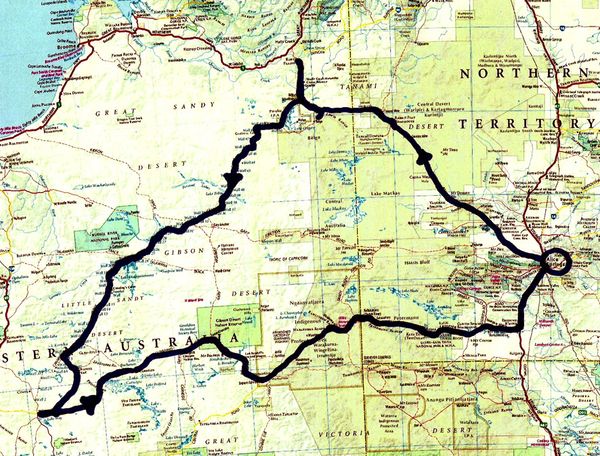 From this Friday, I will be essentially – and, I must admit, largely blissfully – out of touch with the world. I am off on an epic four-wheel-drive tour of a large chunk of the Australian outback, starting and ending in Alice Springs, and traversing four deserts, the Tanami, the Great Sandy, the Little Sandy, and the Gibson. Here’s a general map of the route: