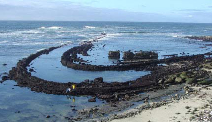 The Moss Beach Syncline, a broad fold, is exposed at low tide in the James V. Fitzgerald Marine Preserve. Folded sedimentary layers of the plunging syncline consist of fossilerous sandstone and mudrocks of the Purisima Formation (Miocene to Pliocene age). The Seal Cove Fault scarp is associated with a submerged ridge located near where the waves break just offshore of the syncline. [USGS]