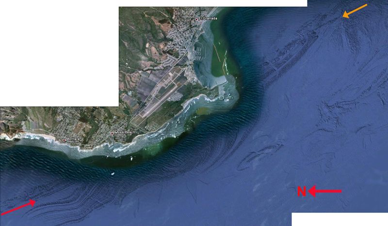 I enjoyed this post immensely, having at one stage of my life been a structural geologist and one who continues to take great delight from the artistic and humbling manifestations of deformation and mountain-building. Then, recently, I was catching up on some of the remarkable imagery that’s available through Google Earth’s “underwater terrain” facility; having written about the Monterey Submarine Canyon, I immediately zoomed in to some of the incredible high-resolution data from the floor of the canyon that has been provided by the Monterey Bay Aquarium Research Institute. I have to admit that Google’s insistence on including a sort of “sunlight reflecting off moving virtual waves” effect is irritating and can obscure some of the detail, but nevertheless it’s impressive. Having scrutinised the canyon, I then took off northwards, looking for other areas of high-resolution images along the California coast, and was astonished when I came to what were clearly “folds a-plunging” in the sea-floor off San Mateo County - the overall image is at the top of this post. My reaction was “Wow - what is going on here?” and that, of course, precipitated a bit of a research journey.