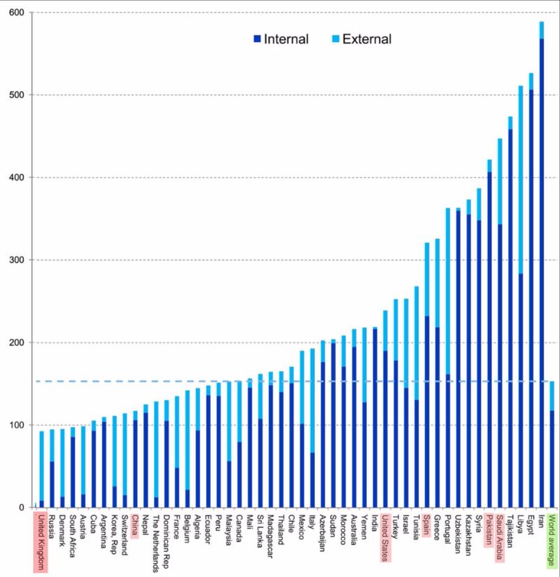 Blue water footprint of national consumption for countries with a population larger than 5 million, shown by internal and external component (cubic meter per year per capita,1996–2005)