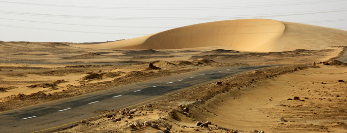 What’s wrong with the sign above? In the recent issue of Geology Today, Tony Waltham of Nottingham Trent University wrote about this roadside sign he had encountered in Oman, warning of dune encroachment. However, there’s a slight error - clues in the inset photograph of barchans on the march across vehicle tracks and my own picture from Egypt’s Western Desert below.