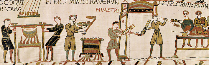 The Normans brought not only a whole new language to these islands, but a whole new cuisine. They introduced rabbits to the UK. The Bayeux Tapestry shows the invaders feasting upon arrival on these shores, and my personal interpretation is that the scene below depicts rabbit kebabs and spit-roasted rabbit.