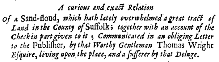 Sandstorms and migrating dunes in the English countryside? This whole area of East Anglia, a low-lying and very dry area of heath known as Breckland, or “the Brecks,” is covered in sand beneath the surface, sand that was derived from the geological rubbish left behind by the Ice Age glaciers and the meltwater rivers that poured across the bedrock chalk of the region. As climatic conditions - and man’s activities - changed, the sands would become active and accumulate into dune fields, marching across the Brecks. Periods of activity were interspersed with periods of stability, the sands covered by soil until they broke free once more. A first-hand account of the inundation of Santon Downham was written by a resident, Thomas Wright, who, in 1668, described in a letter to the Royal Society, published in its Philosophical Transactions, the encroachment of the sand and his struggles to preserve his house; he also suggested the origin of the sand and his ideas turn out to be quite accurate. For a very modest sum, the original letter can be downloaded from the Royal Society archives, and it makes for fascinating reading. Here’s the title (remember the old ufe of “f’s” for “s’s”):