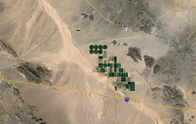 The 4,430 acres of western Arizona“currently irrigated” are south of the hamlet of Vicksburg in the Ranegras Valley of La Paz County. The land had previously been under cultivation for corn, cotton and other crops, including smaller amounts of alfalfa for hay, all watered from around 15 high productivity wells. The extent of this irrigated land, just north of Interstate 10 160 kilometres west of Phoenix, is clearly visible on the otherwise desiccated alluvial fans: