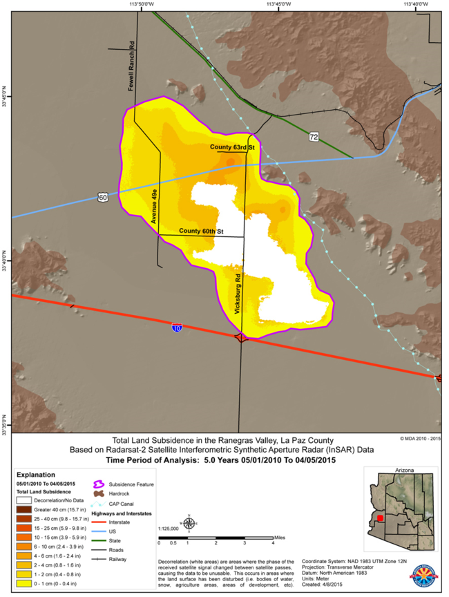 And then there’s the ground subsidence caused by that water extraction. The Arizona Department of Water Resources publishes analyses of this problem, and it it is very clear that subsidence of up to 15 cms has occurred over the last five years in the cultivated area of Ranegras Valley: