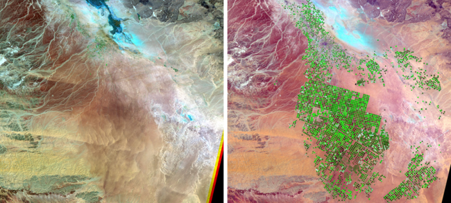 These farming operations are, after all, taking place in Saudi Arabia. It wasn’t that long ago that the country had substantial reserves of groundwater, sufficient for considered and rational development. Dramatically insufficient, however, to support the the attempt, since the 1970s, to become self-sufficient in wheat production, with at one point 20 per cent of its oil revenues devoted to supplying the necessary water. It is now abandoning this goal, but the country’s water use tripled between 1980 and 2006, aquifer levels dropped dramatically and groundwater became brackish in many areas. This determination to make the desert bloom is startlingly illustrated by NASA images of Wadi As-Sirhan near the Jordanian border in 1986 and 2013 (the green circles are centre-pivot irrigation “fields” fed from wells a kilometre deep):
