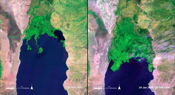 The Omo Delta, at the north end of Lake Turkana, a lake now located mainly in Kenya. Left: February 1, 1973. Right: January 24, 2005 to February 12, 2006. In 1973, the delta was contained entirely within the boundaries of Ethiopia. By 2005-2006, the southernmost point of the delta had moved roughly 12 kilometers (7 miles) to the south, and had crossed the Ethiopia-Kenya border. Reduced lake levels — from less rain, more diverted upstream water, and increased evaporation due to higher temperatures — are believed to be the primary cause, with an increase in sediment from agricultural activities also contributing. The expanded delta has provided new land for 20,000 Dassanech people, the area?s traditional inhabitants. But severe flooding in 2006 killed 100 of them and destroyed houses, crops and infrastructure.