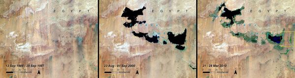 Toshka, Egypt. Left: September 13, 1984 to September 29, 1987. Center: August 23 to September 1, 2000. Right: March 21 to 28, 2010. In the mid-1990s, excess water was channeled from the Lake Nasser reservoir on the Nile River to the Toshka Depression in the Western Desert, creating a series of lakes. This “New Valley Project” was to relieve overcrowding within the Nile Valley and boost the economy. Despite soil poorly suited to irrigation, the area produced grapes, cantaloupes, tomatoes, cucumbers, citrus fruits and wheat. But Lake Nasser water levels fell after 1998 and flow to Toshka ceased in 2001. At the current rate of decline, the new lakes will be lost to evaporation within the next few years.