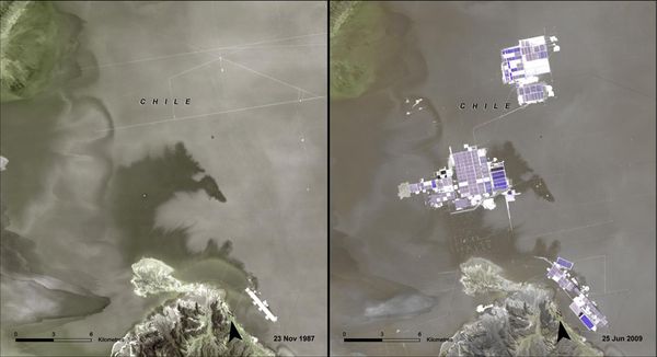 The Atacama Desert, Chile. Left: November 23, 1987. Right: June 25, 2009. Population has doubled here over the past two decades due to explosive tourist development in the 1990s and a mining boom in the 1980s, when companies began to extract lithium and other minerals from the Atacama Salt Flats. Today the mining, tourism, domestic and agricultural sectors compete for the region’s resources, and the main source of conflict is access to water. These images show the growth of mining operations from their beginning (white rectangle at lower right of the 1987 image) to a more recent level (purple and while rectangles in the 2009 image).