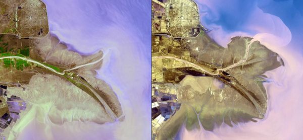 The Aral Sea, located in Kazakhstan and Uzbekistan in central Asia. Left: June 4, 1977. Center left: September 17, 1989. Center right: May 27, 2006. Right: June 3, 2009. Once one of the largest inland bodies of salty water in the world and the second largest sea in Asia — 70,000 square kilometers or 27,000 square miles in area — the Aral Sea has shrunk dramatically over the last 30 years. One of the main reasons is crop irrigation: water has been drawn off from the rivers that kept the Aral Sea filled. As the sea has shrunk, the local climate has become harsher, there have been contaminated dust storms, and drinking water and the local fishing industry have been lost. By the late 2000s, the Aral Sea had lost four fifths of its water volume.