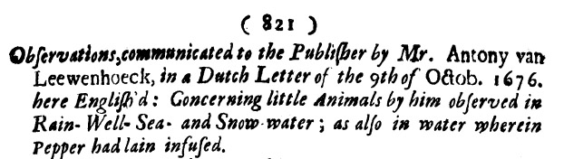Observations, Communicated to the Publisher by Mr. Antony van Leewenhoeck, in a Dutch Letter of the 9th of Octob. 1676. Here English’d: concerning Little Animals by Him Observed in Rain-Well-Sea. and Snow Water; as Also in Water Wherein Pepper Had Lain Infused