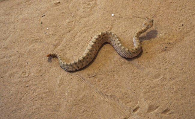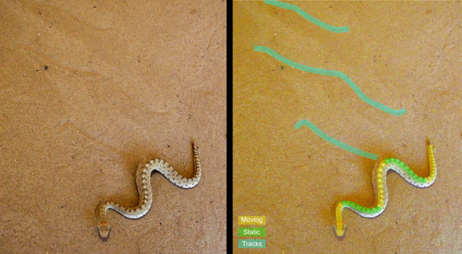 Perhaps the strangest movement pattern of desert animals is the famous “sidewinding” locomotion, seen in certain snakes of sandy deserts around the world. While prominent herpetologist Clifford H. Pope wrote in 1955 “A study of [sidewinding] is recommended to anyone who likes to be confused,”, the underlying motion is quite clear when examined in detail. The snake lifts its head and moves it forward, placing it on the ground, then repeats this motion in a propagating wave down the body – see Science paper supplementary movies.