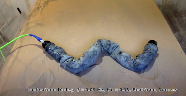 This provides a great experimental tool, because the physics of sand have yet to be reduced to simple systems of equations (as has been the case in fluids for almost 200 years), making computer modeling of results difficult and time-consuming. However, the snake robot provides a “physical model” for movement in sand, allowing us to test hypothesized biological mechanisms. Further observations of biological snakes have revealed the modifications of the two-wave template responsible for effectively sidewinding up inclines and turning (see the recent PNAS paper), which in turn have further improved the effectiveness of the robot.