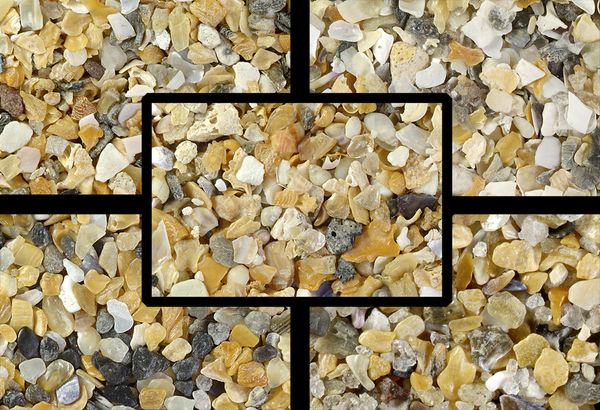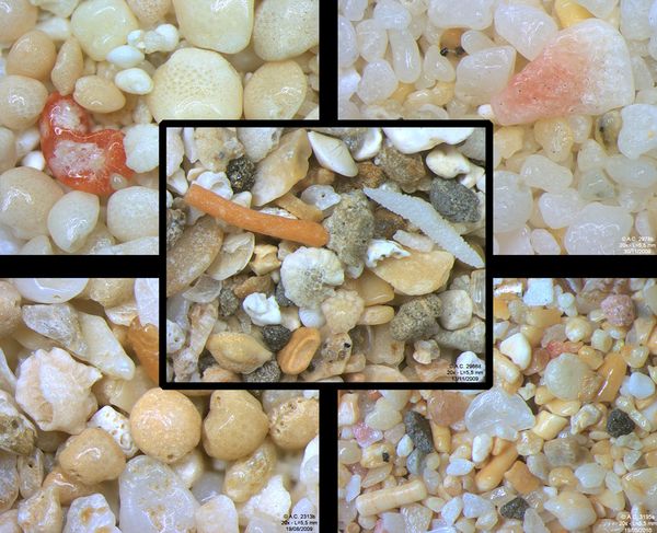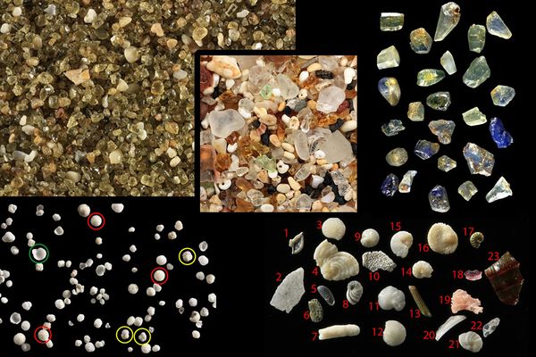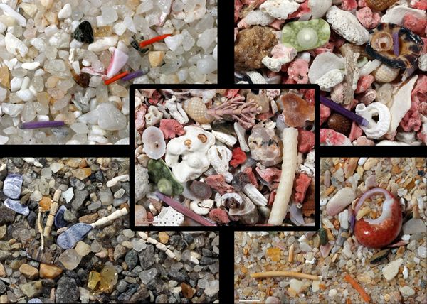 Clockwise from top left: Bahia de Samana, Dominican Republic; Myrdal, Vik, Iceland (olivine and obsidian); Al Bustan, Oman; Brétignolles, France; Center: Enubuj Island, Kwajalein Atoll, Marshall Islands.