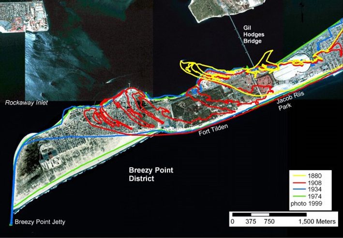 Larry told us how the beach had grown over the last fifty years, partly as the result of the construction of the jetty at the end of the sand spit, the longshore drift of sand down the coast from Long Island being backed up behind it, building back eastwards along the coast. So I looked at the USGS website and immediately found two publications on the sedimentary history of Breezy Point and the Gateway National Recreation Area. The links are given at the end of this post, but here’s the introduction to one of them, and an image that dramatically shows the scale of shifting sands over little more than a century: