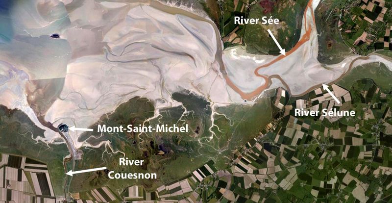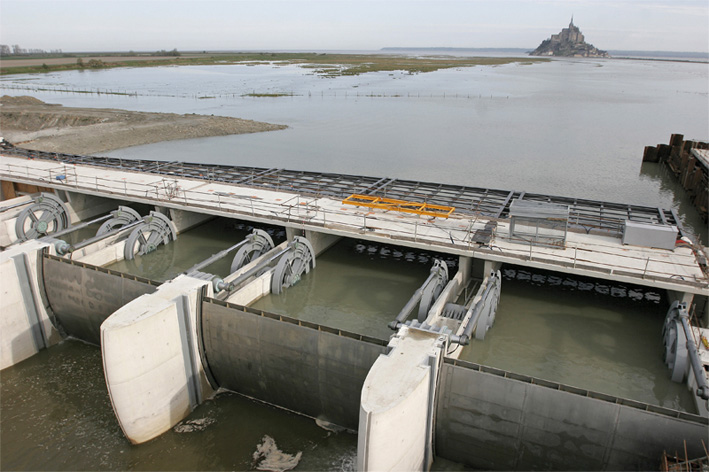 The bay of Mont-Saint-Michel, in the coastal corner of France between Normandy and Brittany, boasts the fourth-largest tidal range in the world – up to 14 meters (46 feet) and the sedimentary drama to go along with it. It is an incredibly complex system. The tides carry sand and silt into the bay and leave much of it behind, augmented by the sedimentary loads brought down to the bay by the three rivers that drain into it. Roughly 700,000 cubic meters of sediment are added to the bay every year – it is, quite naturally, silting up (or, more attractively in French, experiencing ensablement – sanding up). As a result, the iconic World Heritage Site of the monastery towering above its isolated rock is increasingly losing its magnificent isolation and becoming united with the mainland. But this natural process has been greatly exaggerated by human meddling over the centuries and the rhythms of the bay profoundly changed and subdued. The natural processes operate on a scale far beyond that of any human endeavour, but it is possible to mitigate the effects of our meddling and restore the bay to at least close to its unhindered condition and allow natural ensablement to take its course. And that is exactly what is going on today in the bay, after years of preparatory work and research by a syndicate of authorities and institutions – a grand experiment so that Mont-Saint-Michel “ recovers pride of place as the central feature of the Bay, amid a seascape of sands constantly being reshaped by tidal and river water.”