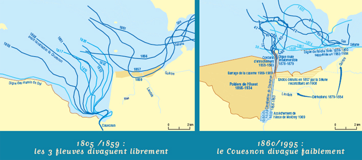 Mont-Saint-Michel began as an isolated rock remaining emergent from the bay as rising sea levels inundated the land following the end of the last ice age; it was periodically connected to the mainland by a natural spit of sand, a tombolo. But then, in 708 so the story goes, St. Michael approached the bishop of nearby Avranches, Aubert (later also a saint) and demanded that a monastery be built on the rock. Foolishly, Aubert ignored this request, finally setting about the task only after the irritated angel had burned a hole in the bishop’s head with his finger (now there’s a warning about procrastination and disobeying orders). The monastery and then abbey grew up over the centuries and then declined; after the French revolution, it became a prison that welcomed, among many anti-republicans, Victor Hugo – he described the tide as coming into the bay “with the speed of a galloping horse.” Along with this tide came the human one – pilgrims both religious and touristic. Today, it is the most-visited site in France outside Paris – three million people visit each year. It was teeming even in mid-September when I arrived, the massive parking lot and causeway (built where the tombolo used to be) filled with cars, camper-vans and buses. The causeway completely cuts off the natural currents and sediment movement of the inner bay, but it is by no means the only manmade disruption. In the 1850s, the channels of the Rivers Sée and Sélune were eroding the agricultural area south of where they entered the bay, and a dike (“digue”) was constructed to force their flow further north; over the following decade, the channel of the River Couesnon was completely controlled and “canalised” all the way out beyond Mont-Saint-Michel itself (the artificial banks for much of this were eroded or overwhelmed by sand by the 1960s). Critically, in 1969, a dam was built across the Cuesnon that effectively ended the power of the river to flush sediment out into the bay. The result of all these interventions was increased natural and manmade growth of the “polders,” the salt marshes that invade the bay and provide valuable agricultural land, together with accelerated sedimentation around the Mount itself. In modern times, the foundations of Mont-Saint-Michel were buried under two meters of sand that had built up since the nineteenth century - the entire sedimentological system of the inner bay was changed – dramatically illustrated in the two maps below showing the locations and changes to the river channels before and after these “management” initiatives.