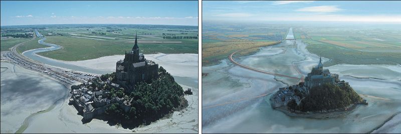 The effects of the project will be gradual, but in thirty years or so it is anticipated that the mean level of the sea bed around Mont-Saint-Michel will be 70 centimeters lower than today, millions of cubic meters of sediment will have been removed (much of it quite quickly), and the sea will have recaptured 50 hectares of today’s land. The scene today, below left, will have evolved into something like the view on the right. This is an extraordinary and ambitious project, a fascinating experiment in large-scale restoration of the natural landscape.
