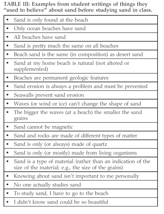 Among the examples she discusses is a wonderful example of the results of place-based learning by high school teachers taken first to the beach and then to the lab to pursue experimental enquiry through personal connections. The original exercises are described here, in what is, in itself, an excellent and valuable report well-worth reading). However, it’s what Seraphin includes as feedback from the students that I found particularly intriguing. In their writings, the students were encouraged to record what they “used to believe” about sand and subsequently recognised as misconceptions following the learning process. Here they are: